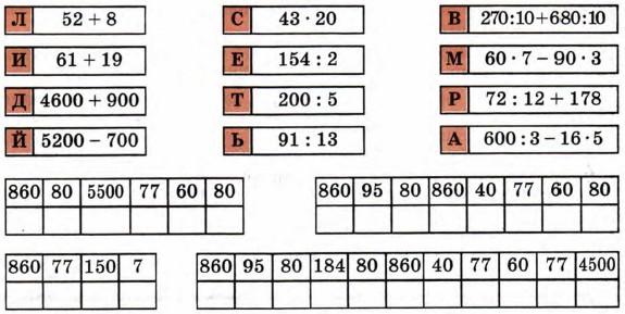 Часть 1. Урок 9 Оценка частного. Математика 4 класс7. Выполни действия: а) (375 018 + 5678 • 924) : 7 - 15 192; б) 4 280 185 + (89 040 • 705 - 478 760) : 8. 8. Запиши с помощью букв переместительное и сочетательное свойства сложения и умножения. Пользуясь ими, упрости выражения: 23 + a + 67 42 + 6 +34 + 128 15 • с • 4 2 • d • 7 • 5 • 5 • 2 9. Продолжи ряд на три числа, сохраняя закономерность: а) 15, 16, 18, 21, 25, ... б) 4, 7, 13, 22, 34, ... 10. Составь выражение и найди его значение. Придумай задачи с другими величинами, которые решаются так же. а) За 4 часа теплоход прошел 136 км. Сколько километров он пройдет за 8 часов, двигаясь с той же скоростью? б) Путь от одной станции до другой товарный поезд прошел за 9 часов, а пассажирский за 6 часов. Чему равна скорость пассажирского поезда, если скорость товарного поезда равна 40 км/ч? в) Геологи 3 часа летели на вертолете со скоростью 95 км/ч, затем 2 часа ехали верхом со скоростью 12 км/ч. Чему равен путь, который проделали геологи за это время? 11. Найди для каждого неравенства множество его решений: а) x + x ≤ 2; б) 5 - у < 2; в) 12 + z ≤ 2. 12. Расшифруй скороговорку: