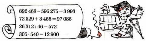 5. За а одинаковых мячей уплатили b рублей, а за c кукол по одной цене уплатили d рублей. На сколько одна кукла в этой покупке стоит дороже одного мяча? Составь выражение и найди его значение для а = 18, b = 900, с = 16, d = 1600. 6. а) В роще 240 берез, а кленов на 93 меньше. Сосен в ней вдвое больше, чем кленов, а елей — в 3 раза меньше, чем сосен и берез вместе. Сколько всего деревьев в этой роще? б) Из леса принесли 38 грибов: белых, подосиновиков и подберезовиков. Подберезовиков было в а подберезовиков и подосиновиков вместе было 34 гриба. Сколько грибов каждого вида принесли из леса? 7. При делении на 96 оказалось, что частное равно 325, а остаток равен 37. Какое число делили?