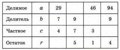 3. а) 57 яблок разложили на кучки по 6 яблок в каждой. Сколько получилось кучек и сколько яблок осталось? б) Когда сливы разложили на 36 тарелок по 12 слив, осталось еще 7 слив. Сколько было слив? в) Было 120 конфет. После того как каждому ученику раздали по 4 конфеты, осталось 12 конфет. Сколько было учеников? 4. Пользуясь формулой деления с остатком а = b • с + r, где r < b, заполни таблицу: