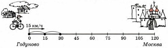 8. а) Из деревни Годуново в Москву выехал велосипедист со скоростью 15 км/ч. Расстояние от Годунова до Москвы равно 120 км. Покажи движение велосипедиста на числовом луче и определи, на каком расстоянии от Годунова и от Москвы был он через 3 ч после выезда? Через 7 ч? Через сколько времени он прибыл в Москву?