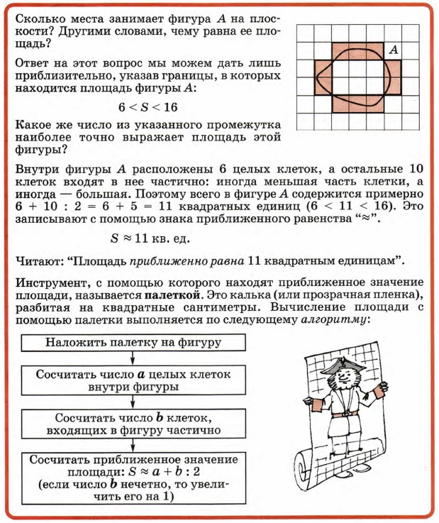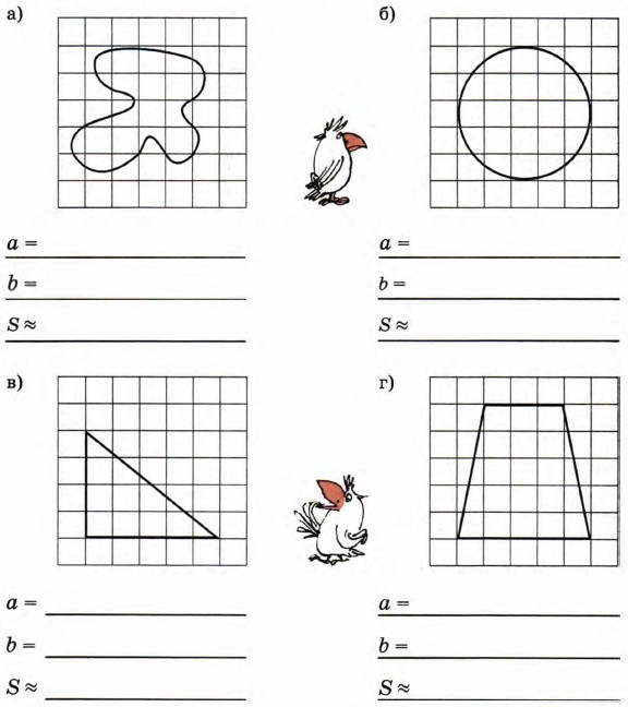1. На фигуры наложены палетки. Вычисли приближенно площади этих фигур, если площадь каждой клетки равна 1 кв. ед.
