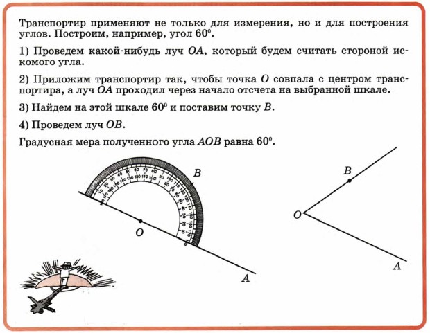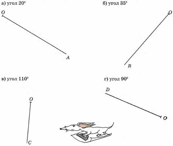 2. Начерти луч ОА. С помощью транспортира отложи по одну и ту же сторону от этого луча углы: ∠ АОВ = 30°, ∠ АОС = 60°, ∠ AOD = 90°, ∠ АОЕ = 120°, ∠ АОМ = 150°, ∠ АОК = 180°. Назови по рисунку несколько острых, прямых и тупых углов. Что ты замечаешь? 3. Отложи указанные углы по обе стороны данных лучей: