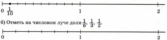 4. а) Расположи в порядке возрастания числа: б) Расположи в порядке убывания числа: 5. а) На числовом луче единичный отрезок разделен на 10 равных частей. Сколько этих частей содержат доли