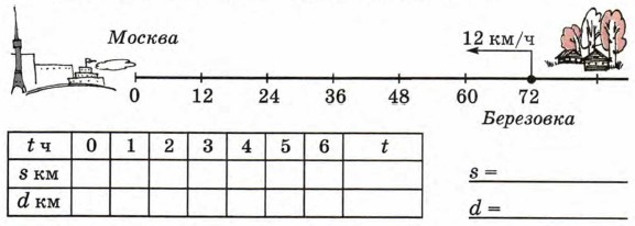 7. Из деревни Березовки, находящейся на расстоянии 72 км от Москвы, выехал велосипедист. В каком направлении и с какой скоростью он едет? Покажи его движение по числовому лучу и заполни таблицу, где t ч — время движения, s км — пройденный путь и d км — его расстояние от Москвы. Запиши формулы зависимости величин S и d от времени движения t.