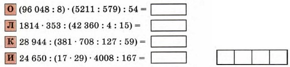 11. Реши уравнения: а) 800 - (90 • x + 17) = 423; б) 240 : (y : 15) - 18 = 42. 12. Расшифруй имя одной из девяти богинь-покровительниц наук и искусств в греческой мифологии, расположив ответы примеров в порядке возрастания и сопоставив их соответствующим буквам: