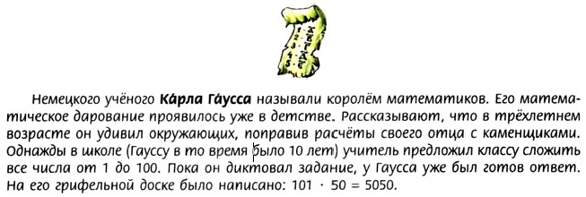 389. Попробуйте догадаться, как Карл Гаусс складывал числа от 1 до 100. 390. Из проволоки длиной 15 м делают обручи длиной 2 м. На сколько обручей хватит проволоки? Можно ли изготовить 4 обруча? 8 обручей? 391. Вычислите, выбирая удобный порядок выполнения действий: а) 937 - (137 + 793); г) (747 + 896) - 236;