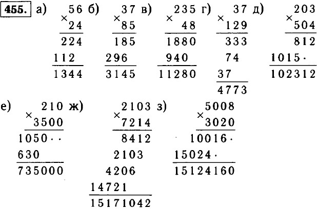 450. а) 704 + 704 + 704 + 704 = 4 • 704 = 2816; б) 542 + 542 + 542 + 618 + 618 = 3 • 542 + 2 • 618 = 1626 + 1236 = 2862. 451. а) 24 • 4 = 24 + 24 + 24 + 24; б) k • 8 = k + k + k + k + k + k + k + k; в) (х + у) • 4 = (х + у) + (х + у) + (х + у) + (х + у); г) (2а - b) • 5 = (2а - b) + (2а - b) + (2а - b) + (2а - b) + (2а - b). 452. Масса всего печения равна 250 • 54 • 150 = 13 500 • 150 = 2 025 000 г = 2025 кг. 453. Составим и решим уравнение: РΔ = АВ + ВС + CD = 27 + 27 : 3 + х = 61 ⇒ х = 61 - 27 - 27 : 3 = 34 - 9 = 25 см. 454. Будет изготовлено: 12 • 20 +15 • 15 = 240 + 225 = 465 деталей.