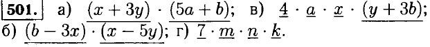 § 3. Умножение и деление натуральных чисел Деление. Домашние работы (окончание)497. Это числа 1, 2, 3; 1 + 2 + 3 = 1 • 2 • 3 = 6. 498. Пусть во дворе х петухов, тогда кур 10х, а уток 21 - (х + 10х) = 21 - 11x. Так как число уток больше 0 больше, то х = 1, поэтому во дворе 21 = 11 • 1 = 10 уток. 499. а) (а + b) • 3 = (а + b) + (а + b) + (а + b); б) (2а - m) • 5 = (2а - m) + (2а - m) + (2а - m) + (2а - m) + (2а - m); в) (5x + 2у) • 6 = (5x + 2у) + (5х42у) + (5x + 2у) + (5x + 2 у) + (5x + 2 у) + (5x + 2 у). 500. а) 7х • (3а + 11); б) (2m + 5n) • (3а - 12b).
