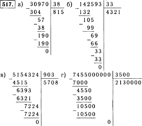 518. а) 9 • (а + 11); б) 114 : (m - n); в) (8 + с) : (76d - 4). 519. За один час первый экскаватор вынимает 555 : 3 = 185 м3 земли, второй экскаватор за час вынимает 185 + 15 = 200 м3, значит за 4 часа он вынимает 200 • 4 = 800 м3. 520. Бригады работали 1320 : (20 + 35) = 1320 : 55 = 24 дня, значит первая бригада заготовила 24 • 20 = 480 т силоса, а вторая бригада заготовила 35 • 24 = 840 т. 521. Всего рабочие затратили 3 • 7 + 2 • 8 = 21 + 16 = 37 часов, значит за один час один рабочий изготавливал 481 : 37 = 13 деталей. Первый рабочий изготовил 3 • 7 • 13 = 21 • 13 = 273 детали, а второй 2 • 8 • 13 = 208 деталей. 522. Периметр треугольника в миллиметрах РΔ = АВ + ВС + CD = х + 170 + х = 620 ⇒ 2х + 170 = 620 ⇒ 2х - 450 ⇒ х = 225 мм = 22 см 5 мм. 523. При k = 5719, k : 19 - 95 = 5719 : 19 - 95 = 301 - 95 = 206, значит k — корень уравнения. 524. а) 37х = 259 ⇒ х = 259 : 37 = 7; б) 252 : у = 21 ⇒ у = 252 : 21 = 12; в) z : 18 = 6 ⇒ z = 6 • 18 = 108; г) (38 + b) • 12 = 840 ⇒ 38 + b = 840 : 12 = 70 ⇒ b = 70 - 38 = 32; д) 14 • (р - 30) = 630 ⇒ р - 30 = 630 : 14 = 45 ⇒ р = 45 + 30 = 75; е) (43 - s) • 17 = 289 ⇒ 43 - s = 289 : 17 = 17 ⇒ s = 43 - 17 = 26. 525. 4х + 2 + 1 = 5 + 5 + 5 ⇒ 4х + 3 - 15 ⇒ 4х = 15 - 3 = 12 ⇒ х = 12 : 3 = 4 кг. 526. Выполните упражнение самостоятельно.
