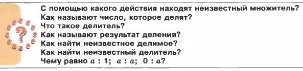 464. При каких значениях буквы верно равенство: a) x • 94 = 846; б) 74 • y = 4292? 465. Найдите значение выражения: а) 0 : 27; б) 85 : 1; в) 87 : 87. 466. Существует ли такое число n, что 0 • n = 6? Можно ли разделить 6 на 0? 467. При каких значениях m верно равенство 0 • m = 0? Можно ли из этого равенства найти единственное значение m? Можно ли разделить 0 на 0? 468. Во время уборки урожая с первого участка собрали 612 т пшеницы, что в 4 раза больше, чем с третьего, а со второго — в 3 раза меньше, чем с первого. Сколько тонн пшеницы собрали с трёх участков? 469. Поезд прошёл 336 км за 4 ч, а автобус — 126 км за 3 ч. Во сколько раз скорость автобуса меньше скорости поезда? 470. За 25 дней завод должен изготовить по плану 2100 станков. Ежедневно сверх плана выпускали 21 станок. За сколько дней был выполнен план? 471. Проверьте с помощью умножения и с помощью деления, правильно ли выполнено деление: а) 9963 : 27 = 369; 6) 44950:725 = 62. 472. Выполните деление: