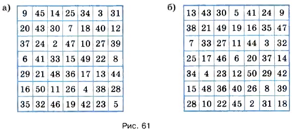 649. Теплоход 3 ч шёл по озеру со скоростью 23 км/ч, а потом 4 ч по реке. Сколько километров прошёл теплоход за эти 7 ч, если по реке он шёл на 3 км/ч быстрее, чем по озеру? 650. Сейчас расстояние между собакой и кошкой 30 м. Через сколько секунд собака догонит кошку, если скорость собаки 10 м/с, а кошки — 7 м/с? 651. Найдите в таблице (рис. 61) все числа по порядку от 2 до 50. Это упражнение полезно выполнить несколько раз; можно соревноваться с товарищем: кто быстрее отыщет все числа?