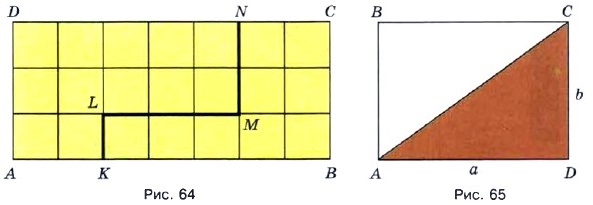 Площади равных фигур равны. Их периметры тоже равны. Линия KLMN на рисунке 64 разбивает прямоугольник ABCD на две части. Одна из частей имеет площадь 12 см2, а другая — 9 см2. Площадь всего прямоугольника равна 3 • 7, то есть 21 см2. При этом 21 = 12 + 9.