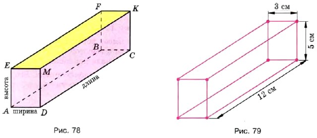 Спичечный коробок, деревянный брусок, кирпич дают представление о прямоугольном параллелепипеде. Поверхность прямоугольного параллелепипеда состоит из 6 прямоугольников (рис. 78), каждый из которых называют гранью прямоугольного параллелепипеда.