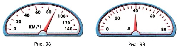 857. Автомобиль приближается к городу, по улицам которого разрешается ехать со скоростью не более чем 60 км/ч. В кабине автомобиля установлен спидометр — прибор, показывающий скорость движения. Посмотрите на спидо́метр (рис. 98). Нарушит ли шофёр правила уличного движения, если не снизит скорость? На сколько и в какую сторону передвинется стрелка, когда скорость снизится до 50 км/ч? Каким будет показание спидометра, когда автомобиль остановится? 858. На рисунке 99 изображена шкала прибора, показывающего, сколько литров бензина осталось в баке автомобиля. Сколько литров бензина сейчас в баке? На сколько делений и в какую сторону передвинется стрелка прибора, если: а) в бензобак нальют ещё 20 л бензина;