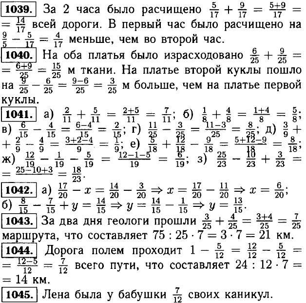 1046. Было взято 18 • 5 : 1 = 90 кг сливок. 1047. За третий день автомашина проехала 980 - 725 = 255 км. Во второй день она проехала 255 + 123 = 378 км, а в первый день 725 - 378 = 347 км. 1048. На мотоцикле турист ехал со скоростью (378- 60 • 4) : 3 = 138 : 3 = 46 км/ч.