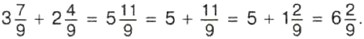 Иногда при сложении смешанных чисел в их дробной части получается неправильная дробь. В этом случае из неё выделяют целую часть и добавляют её к уже имеющейся целой части. Например: