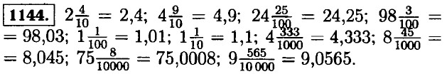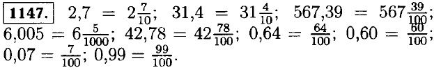 1145. а) 2,7 — две целых семь десятых; 11,4 — одиннадцать целых четыре десятых; 401,1 — четыреста одна целая одна десятая; 666,6 — шестьсот шестьдесят шесть целых шесть десятых; 0,8 — ноль целых восемь десятых; 9,9 — девять целых девять десятых; 99,9 — девяносто девять целых девять десятых; 909,9 — девятьсот девять целых девять десятых; б) 5,64 — пять целых шестьдесят четыре сотых; 21,87 — двадцать одна целая восемьдесят семь сотых; 381,77 — триста восемьдесят одна целая семьдесят семь сотых; 54,60 — пятьдесят четыре целых шестьдесят сотых; 2,80 — две целых восемьдесят сотых; 0,55 — ноль целых пятьдесят пять сотых; 0,09 — ноль целых девять сотых; 0,77 — ноль целых семьдесят семь сотых; в) 1,579 — одна целая пятьсот семьдесят девять тысячных; 12,882 — двенадцать целых восемьсот восемьдесят две тысячных; 326,703 — триста двадцать шесть целых семьсот три тысячных; 145,008 — сто сорок пять целых восемь тысячных; 21,094 — двадцать одна целая девяносто четыре тысячных; 0,049 — ноль целых сорок девять тысячных; 0,001 — ноль целых одна тысячная; г) 203,6 — двести три целых шесть десятых; 20,36 — двадцать целых тридцать шесть сотых; 0,02036 — ноль целых две тысячи тридцать шесть стотысячных; 0,20506 — ноль целых двадцать тысяч пятьсот шесть стотысячных; 0,010101 — ноль целых десять тысяч сто одна миллионная. 1146. а) 7,8; 5,45; 0,59; 78,01; 4,601; 76,032; б) 6,006; 0,02; 9,003; 785,005; 33,0008.