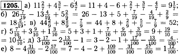 1206. Первый поезд до встречи находился в пути 416 : 52 = 8 ч. Второй поезд до встречи находился в пути (782 - 416) : 61 = 366 : 61 = 6 ч. Следовательно, первый поезд вышел на 8 - 6 = 2 ч раньше второго. 1207. Расстояние 540 км между поездами будет через 540 : (85 + 50) = 540 : 135 = 4 ч. 1208. Скорость поезда равна 2 • 35 = 70 км/ч. Скорость хода пешком равна 70 - 65 = 5 км/ч. Путь от города до села равен 70 • 5 +35 • 2 + 5 • 3 = 350 + 70 + 15 = 435 км. 1209. Прибавка зерна со всей площади составила (28 - 18) • 1260 = 10 • 1260 = 12600 ц. 1210. а) 14х - (8х + 3х) = 1512 ⇒ 14х - 11х = 1512 ⇒ 3х = 1512 ⇒ х = 1512 : 3 = 504; б) 11у - (5y - 3у) = 8136 ⇒ 11у - 2у = 8136 ⇒ 9х = 8136 ⇒ у = 8136 : 9 = 904.