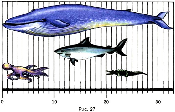 137. Начертите отрезок длиной 10 см и разделите его штрихами на 5 равных частей. Напишите над одним концом отрезка число 0, а над другим — число 10. Напишите числа над каждым штрихом шкалы. 138. Выразите в граммах: а) 3 кг 900 г; б) 2 кг 70 г; в) 11 кг. 139. Выразите в тоннах: а) 6000 кг; б) 5000 ц; в) 18 000 кг. 140. Выразите в килограммах: а) 6 ц 82 кг; б) 3 т 7 ц; в) 15 т 750 кг. 141. Купили 3 пакета кефира, по 250 г в каждом, и несколько пакетов кефира по 500 г. Сколько приобрели пакетов кефира по 500 г, если всего купили 2 кг 250 г кефира? 142. Найдите длину каждого животного по рисунку 27. На сколько метров кит длиннее акулы? На сколько метров крокодил короче осьминога? Одно деление шкалы — 1м.