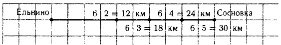124. За 2 ч ходьбы пешеход, идущий со скоростью 6 км/ч из Ельнино в Сосновку, пройдет 6 • 2 = 12 км. За 3 ч он пройдет 6 • 3 = 18 км, за 4 ч — 6 • 4 = 24 км, за 5 ч — 6 • 5 = 30 км и окажется в Сосновке.