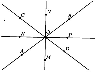 129. На чертеже лучи: ОА, ОВ, ОС, OD, ОК, ОР, ОМ, ON. Прямые АВ, CD, MN, КР делят плоскость на 8 частей.