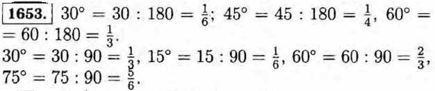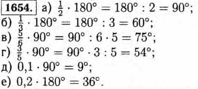 1655. а) 360° : 100 • 2 = 72°; б) 60° : 100 • 25 = 15°; в) 180° : 100 • 45 = 81°; г) 90° : 100 • 80 = 72°. 1656. а) в 3 ч — угол 90°; б) в 5 ч — угол 180° : б - 5 = 150°; в) в 10 ч — угол 180° : 6 - 2 = 60°; г) в 11 ч — угол 180° : 6 = 30°; д) в 2 ч 20 мин — угол 120° - 70° = 50°; е) в 5 ч 30 мин — угол 180° - 165° = 15°.