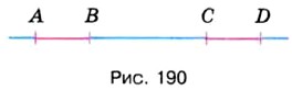 1767. На луче РК взята точка М так, что РМ = 5 см. Сколько отрезков длиной 3 см можно отложить на луче от точки М? Сколько отрезков длиной 7 см можно отложить на луче от точки М? 1768. На прямой отмечены точки А, В, С и D (рис. 190) так, что АВ = = CD. Поставьте вместо звёздочки знак <, > или = так, чтобы для длин отрезков получилось верное равенство или неравенство: а) BA * DC; в) АС * BD;