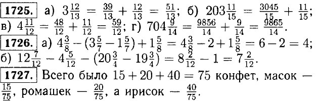 1744. а) числители складываются (вычитаются), а знаменатель остается тем же; б) как натуральные числа, с учётом запятой; в) дроби умножаются как натуральные числа, с учётом запятой; г) запятая сдвигается вправо на 1; 2; 3 знака и т. д.; д) дробь делится на число, только в частном запятая сдвигается влево на число знаков после запятой в делимом; е) число делится на дробь, только в частном запятая сдвигается вправо на число знаков после запятой в делителе; ж) в дроби запятая сдвигается влево на 1; 2; 3 знака и т. д.; з) в дроби запятая сдвигается влево на 1; 2; 3 знака и т. д.; и) в дроби запятая сдвигается вправо на 1; 2; 3 знака и т. д. 1745. а) 427051 : 839 - 390912 : 768 + 252000 : 1260 + 249249 : 249 - 509 - 509 + 200 + 1001 = 1201;
