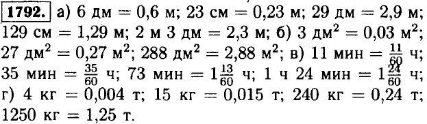 1776. ∠АОВ + ∠DOB = ∠AOD; ∠COD + ∠АОС = ∠AOD; ∠АОВ = ∠AOD - ∠DOB; ∠COD = ∠AOD - ∠АОС. Так как ∠DOB = ∠АОС ⇒ ∠АОВ - ∠COD. 1777. ∠АОВ = ∠COD = 180°; ∠COD = ∠АОС + ∠AOD; ∠AOB = ∠AOD + ∠BOD; ∠AOD + ∠AOC = ∠AOD + ∠BOD; ∠AOC = ∠BOD + ∠AOD - ∠AOD; ∠АОС = ∠BOD. 1778. a) 30° • 2 = 60°; 6) 5 • 30° = 150°; в) 1,5 • 30° = 45°; г) 3,5 • 3° = 10,5°; д) 4,5 • 30° = 135°. 1779. a) 2, 20, 19,2, 0,64; б) 1,4, 4,2, 0,7, 0,93; в) 7,2, 10, 3,6, 4,3; г) 75, 1,5, 0,3, 0,12; д) 5,7, 1,9, 6,3, 7; е) 0,42, 0,7, 3,5, 1; ж) 0,4, 4, 1, 0,05; з) 0,5, 0,3, 4, 0,4. 1780. Пусть х скорость Паши, тогда он догонял Борю со скоростью х - 0,2 — скорость сближения. Составим и решим уравнение: (х - 0,2) • 9 = 0,36 ⇒ х - 0,2 = 0,04 ⇒ х = 0,240 км/мин. 1781. Пусть х — скорость Коли, тогда 2х — скорость Сережи. Составим и решим уравнение: (2х - х) • 6 = 840 ⇒ х = 840 : 6 = 140 м/мин. 1782. Пусть скорость грузовой машины — х, тогда скорость легковой — 2х. Составим и решим уравнение: (х + 2х) • 4 = 480 ⇒ Зх = 480 : 4 = 120 ⇒ х = = 120 : 3 = 40 км/ч — скорость грузовой машины, а скорость легковой машины 2х = 40 • 2 = 80 км/ч. 1783. Пусть х — скорость первого поезда, тогда х + 5 — скорость второго поезда. Составим и решим уравнение: х • 3 + (х + 5) • 3 = 495 ⇒ 3х + 3х = 495 - 15 ⇒ х = 480 : 6 = 80 км/ч — скорость первого поезда, а х + 5 = 80 + 5 = 85 км/ч — скорость второго поезда. 1784. Пусть х — скорость велосипедиста, он ехал 3 + 2 = 5 часов. Составим и решим уравнение: 5x = 144 - 2 • 42 = 144 - 84 - 60 ⇒ x = 60 : 5 = 12 км/ч. 1785. Пусть х — скорость второго пешехода, тогда скорость расхождения пешеходов x + 4 км/ч. Так как они были в пути 3 ч имеем: (х + 4) • 3 = 21 ⇒ х + 4 = 7 ⇒ х = 7 - 4 = 3 км/ч. 1786. Пусть первый велосипедист ехал х часов, тогда второй ехал х - 1 ч. Составим и решим уравнение: 12x - 14(x - 1) = 64 ⇒ 12x + 14x - 14 = 64 ⇒ 26x = 64 + 14 = 78 ⇒ х = 78 : 26 = 3 ч. 1787. Катер прошёл (15,3 + 2,2) • 3 + (15,3 - 2,2) • 4 = 104,9 км. 1788. Скорость теплохода по течению 145 : 6 = 29 км/ч, а его скорость против течения 29 - 2 • 4,5 = 20 км/ч. На обратный путь он затратил 145 : 20 = 7,25 ч = 7 ч 15 мин. 1789. Выполните упражнение самостоятельно. 1790. 1 га = 100 а, 1 а = 100 м2, 1 дм2 = 100 см2, 1 м2 = 10000 см2. 1791. 1 мм2 = 0,01 см2, 1 см2 = 0,0001 м2, 1 м2 = 0,0001 га, 1 га = 0,01 км2.