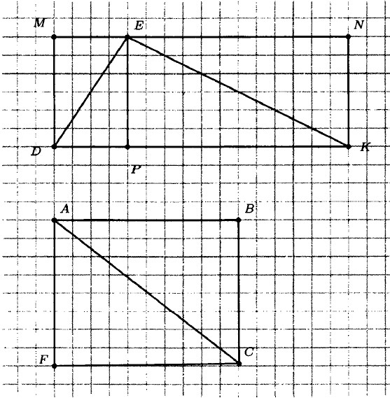 Вопросы и задачи на повторение. Домашние работы (окончание)1793. 1057 мин 17 • 30 + 37 мин = 17 ч 37 мин; самая короткая ночь 24 ч - 17 ч 37 мин = 6 ч 23 мин. 1794. a) S = ab, где а и b — длины его сторон; б) S = а2, где а — длина его стороны; в) V = аbс, где а, b, с — длины его ребер; г) V = а3, где а длина ребра куба. 1795. 1 дм3 = 1000 см3; 1 м3 = 1000 дм3; 1 л = 1 дм3; 1 см3 = 0,001 дм3; 1 см3 = 0,000001 м3. 1796. Из 6 прямоугольников; 6 граней, 12 ребер, 8 вершин. Кубом называется прямоугольный параллелепипед, у которого все ребра равны. Поверхность куба состоит из 6 квадратов. Все ребра куба равны между собой. 1797. а) площади равных фигур равны; б) площадь фигуры равна сумме площадей ее частей; в) объемы равных фигур равны; г) объем фигуры равен сумме объемов ее частей. 1798. S = ab = 24,6 • 18,5 = 455,1 см2 = 4,551 дм2. 1799. а) V = аbс = 28,2 • 30 • 25,5 = 21573 см3 = 21,573 дм3; б) V = а3 = 83 = 256 дм3 = 0,256 м3. 1800. 0,6 м = 60 см, 4 дм = 40 см; S = 60 • 40 = 2400 см2, а = S : b = 2400 : 30 = 80 см. Р1 = 2 • (60 + 40) = 2 • 100 = 200 см; Р2 = 2 • (80 + 30) = 2 • 110 = 220 см; Р2 > Р1. 1801. Пусть ширина прямоугольника равна х, тогда его длина равна 2х. Составим и решим уравнение: (х + 2х) • 2 = 0,36 ⇒ Зх = 0,36 : 2 = 0,18 ⇒ х = 0,18 : 3 = 0,06 м — ширина прямоугольника, 2х = 0,06 - 2 = 0,12 м — длина прямоугольника. Площадь прямоугольника равна S = ab = 0,06 • 0,12 = 0,0072 м2 = 72 см2. 1802. S = 2(ab + ас + bс) = 2 • (12 • 7,5 + 12 • 10 + 10 • 7,5) = 570 см2; V = аbс = 12 • 10 • 7,5 = 900 см3. 1803. V = а • (а + 5) • 4 = 4а • (а + 5). 1804. 0,6 дм — 6 см; 0,04 м = 4 см. Объем куба равен 43 = 64 см3. Объем бруска V = abc = 8 • 6 • 4 = 192 см3. Объем оставшейся части 192 - 64 = 128 см3. 1805. Налито 250 см3 воды. 1806. Равны между собой внешний квадрат верхнего рисунка и внешний квадрат нижнего, внутренний квадрат верхнего и внутренний нижнего рисунка. 1807. С = К, А = Р = М = Х, F = В. 1808. Ребра верхней грани: АВ, BP, РК, К А. Ребра нижней грани: CD, DN, NM, МС. Передняя грань ВРМС. Вершины правой грани: А, В, С, D. Все рёбра куба равны между собой. 1809. Поле разбито на части: АВР, СРВ, АРМ, CDMP. Площадь равна сумме площадей частей поля S = 50 + 60 + 170 + 380 = 660 тыс. м2. 1810. SDEK = SDMEP • 2 + SPENK : 2 = 3 • 2 : 2 + 6 • 3 : 2 = 12 см. SABC = SABCF : 2 = 5 • 4 : 2 = 10 cм2.