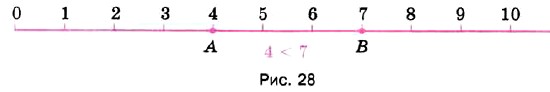 Точка с меньшей координатой лежит на координатном луче левее точки с большей координатой. Например, точка А(4) лежит левее точки В(7) (рис. 28). Нуль меньше любого натурального числа.
