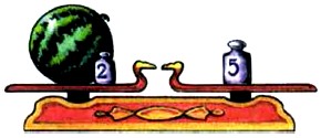 § 2. Сложение и вычитание натуральных чисел 10. УравнениеЗадача. На левой чашке весов лежат арбуз и гиря в 2 кг, а на правой чашке — гиря в 5 кг. Весы находятся в равновесии. Чему равна масса арбуза?