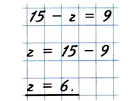 Пример 3. Решим уравнение 15-2 = 9. Р е ш е н и е. По смыслу вычитания, число 15 является суммой 2 и 9, то есть z + 9 = 15. Из этого уравнения находим неизвестное слагаемое: z = 15 - 9, то есть 2 = 6. Число 6 является корнем уравнения 15-2 = 9, так как верно равенство 15-6 = 9.