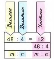 Действие, с помощью которого по произведению и одному из множителей находят другой множитель, называют делением. Пишут: 48 : 4 = 12.
