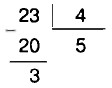 В числе 23 содержится 5 раз по 4 да ещё 3. Имеем: 23 = 4 • 5 + 3.