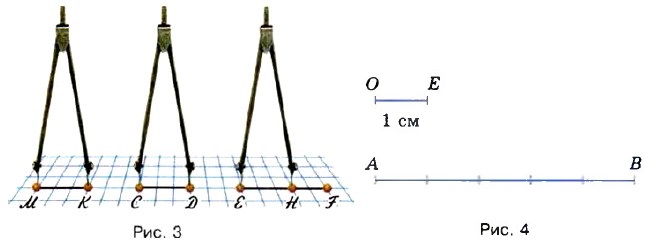 Отрезки можно сравнивать с помощью измерителя. Отрезки МК и CD (рис. 3) равны. Пишут: МК = CD. Отрезок ЕН является частью отрезка ЕЕ. Он короче отрезка EF, а отрезок EF длиннее отрезка ЕН.