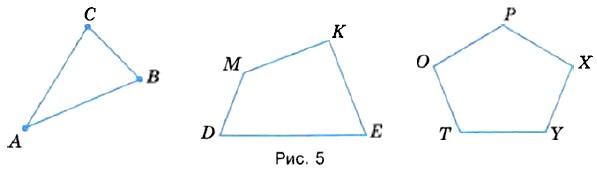 Отрезки АВ, ВС и АС на рисунке 5 вместе составляют треугольник АВС. Их называют сторонами, а точки А, В и С — вершинами треугольника АВС. На этом же рисунке изображены четырёхугольник DEKM и пятиугольник OPXYT. Вершинами четырёхугольника являются точки D, Е, К и М, а его сторонами — отрезки DE, ЕК, КМ и MD.