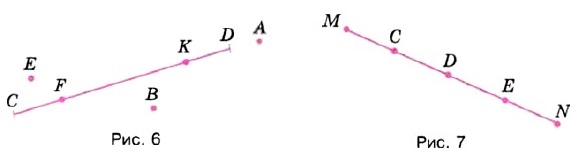 31. Отметьте в тетради точки К и М. С помощью линейки постройте отрезок КМ. Отметьте на этом отрезке точки Р и Т. Назовите отрезки, на которые эти точки делят отрезок КМ. На какие отрезки точка Т делит отрезок КМ? 32. Какие из точек, указанных на рисунке 6, лежат на отрезке CD, а какие из них на этом отрезке не лежат? 33. Какие из точек, указанных на рисунке 7, лежат между точками: а) М и N; б) С и N; в) М и D; г) D и N?