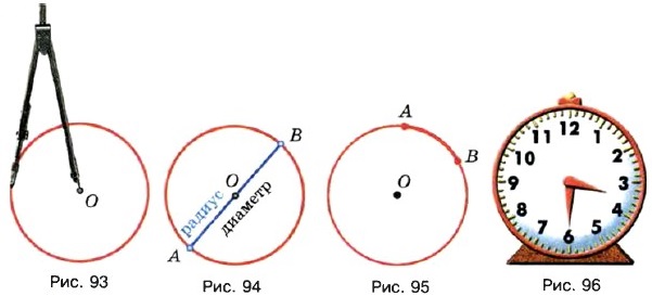 Установим ножку циркуля с иглой в точку О, а ножку циркуля с грифелем будем вращать вокруг этой точки. Тогда грифель опишет замкнутую линию. Её называют окружностью (рис. 93). Окружность делит плоскость на две части. Ту часть плоскости, которая лежит внутри окружности (вместе с самой окружностью), называют кругом. Точку О называют центром и круга, и окружности. При построении окружности расстояние между концами ножек циркуля не изменяется. Поэтому все точки окружности одинаково удалены от её центра.