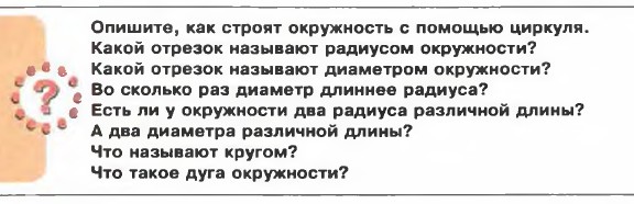 851. Отметьте в тетради точку О. Постройте окружность с центром в этой точке. Измерьте радиус окружности. Чему равен её диаметр? 852. Начертите окружность и отметьте на ней три точки А, В и С. Назовите дуги, на которые эти точки делят окружность. 853. Изобразите круг, радиус которого 3 см. Отметьте точку А внутри круга и точку В вне круга. Измерьте расстояние от центра круга до точки А и до точки В. Сравните эти расстояния с радиусом круга. Соедините точки А и В отрезком. Пересекается ли он с окружностью? 854. Начертите окружность с центром в точке О и радиусом 3 см 5 мм. Проведите прямую, которая пересекает окружность в точках М и К. На каком расстоянии от центра окружности находятся эти точки? 855. Начертите отрезок CD, равный 5 см. Проведите окружность с центром С и радиусом 3 см, а также другую окружность с центром D и радиусом 4 см. Обозначьте точки пересечения окружностей буквами А и В. Чему равны длины отрезков АС, СВ, DA и BD?