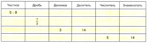 1051. Запишите в виде дроби частные: 2:5; 1 : 10; 15 : 8; 7:1; 20 : 4; 77 : 10. 1052. Запишите каждую из дробей 1053. Заполните пустые клетки таблицы: