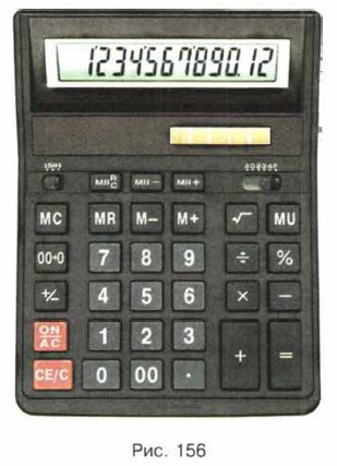 Для удобства и быстрого выполнения вычислений в настоящее время используют микрокалькуляторы (рис. 156). С их помощью можно выполнять арифметические действия — сложение, вычитание, умножение и деление. Чтобы микрокалькулятор работал, надо перевести переключатель питания в положение «ВКЛ». При этом активизируется индикатор (говорят также «экран», «табло»). Ниже индикатора расположена клавиатура, на которой есть клавиши с изображением цифр и клавиши с обозначением действий.