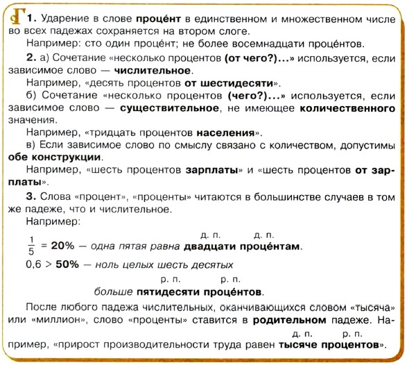 Для краткости слово «процент» после числа заменяют знаком %. Предложение «В поход ушли 1,5% учащихся нашей школы» читают так: «В поход ушли полтора процента учащихся нашей школы», а предложение «В этом месяце заработная плата выросла на 8%» читают так: «В этом месяце заработная плата выросла на восемь процентов».