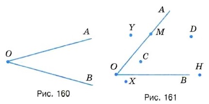 При записи угла в середине пишут букву, обозначающую его вершину. Угол можно обозначить и одной буквой — названием его вершины. Например, вместо «угол АОВ» пишут короче: «угол О». Вместо слова «угол» пишут знак ∠. Например, ∠АОВ, ∠О. На рисунке 161 точки С и D лежат внутри угла АОВ, точки X и Y лежат вне этого угла, а точки М и Н — на сторонах угла.