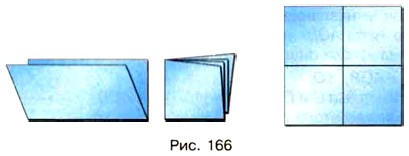 Согнём два раза пополам лист бумаги, а потом развернём его (рис. 166). Линии сгиба образуют 4 равных угла. Каждый из этих углов равен половине развёрнутого угла. Такие углы называют прямыми.