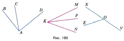 Такой луч называется биссектрисой угла. 1658. С помощью транспортира проведите луч, который делит пополам прямой угол. 1659. Постройте угол АО В в 120° и разделите его на 3 равных угла. 1660. Какие из углов острые и какие тупые, если ∠A = 67°; ∠B = = 175°; ∠C = 92°; ∠D = 3°? 1661. С помощью чертёжного треугольника найдите на рисунке 180 острые, прямые и тупые углы. С помощью транспортира найдите их градусную меру. 1662. Начертите круг радиусом 3 см. Обозначьте его центр буквой О. Проведите через точку О прямую АВ. С помощью транспортира разделите развёрнутые углы АОВ с обеих сторон прямой на 3 равных угла. На сколько равных частей разделился круг?