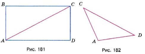 1665. Чему равна градусная мера каждого угла прямоугольника? Чему равна сумма этих градусных мер? Чему равна сумма градусных мер углов каждого из треугольников АВС и CDA (рис. 181)? 1666. Измерьте каждый угол треугольника ACD, изображённого на рисунке 182. Найдите сумму градусных мер этих углов. 1667. Начертите какой-нибудь треугольник и измерьте каждый его угол. Проверьте, что сумма градусных мер углов треугольника равна 180°.