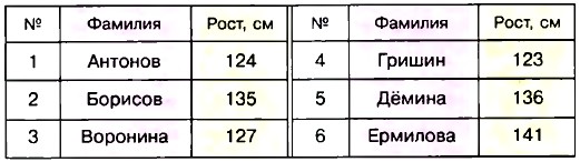153. Отметьте на координатном луче все натуральные числа, которые: а) меньше 9; б) больше 10, но меньше 14. 154. Я задумал число, оканчивающееся цифрой 5. Оно больше, чем 210, и меньше, чем 220. Какое это число? 155. В следующей таблице указан рост учащихся. Назовите их фамилии: а) в порядке возрастания их роста; б) в порядке убывания их роста.