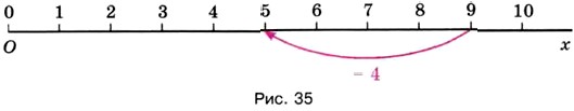 Разность двух чисел показывает, на сколько первое число больше второго, иными словами, на сколько второе число меньше первого. На рисунке 35 вычитание 4 из 9 показано на координатном луче.