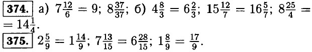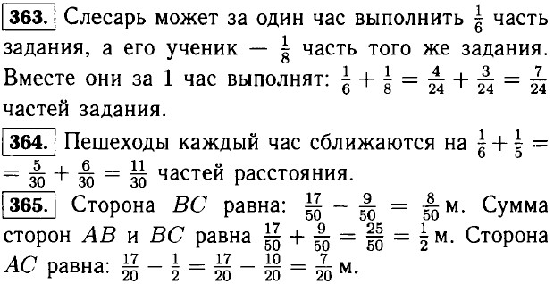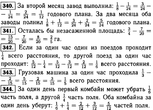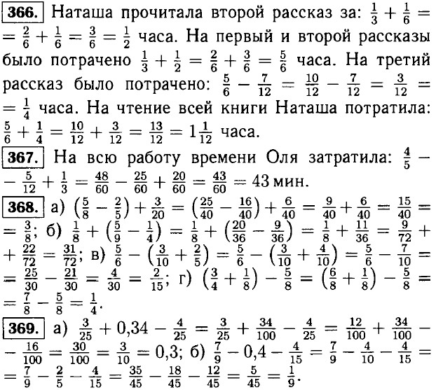 370. Легковая автомашина за 20 минут проехала: 1,5 • 20 = 30 км. Грузовая автомашина за 20 минут проехала 1 • 20 = 20 км. Расстояние от села до рабочего посёлка равно: 30 - 20 = 10 км. 371. «Ракета» проплывает за 3 часа: 55 • 3 = 165 км, а баржа за это же время проплывает: 25 • 3 = 75 км. За 3 часа «Ракета» догонит баржу и обгонит её на 165 - 50 - 75 = 40 км. 372. В пути скорый поезд был: 16 - 12 = 4 ч. За это время он преодолел расстояние: 70 • 4 = 280 км, а товарный поезд был в пути: 4 + 3 = 7 ч. Скорость товарного поезда равна: 280 : 7 = 40 км/ч. 373. а) 18,305 : 0,7-0,0368 : 0,4 + 0,492 : 1,2 = 26,15 - 0,092 + 0,41 = 26,56 - 0,092 = 26,468; б) (0,0288 : 1,8 + 0,7 • 0,12) • 35,24 = (0,016 + 0,084) • 35,24 = 0,1 • 35,24 = 3,524; в) (15,964 : 5,2 - 1,2) • 0,1 = (3,07 - 1,2) • 0,1 = 1,87 • 0,1 = 0,187; г) (21,62 • 3,5 - 52,08 : 8,4) • 0,5 = (75,67 - 6,2) • 0,5 = 69,47 • 0,5 = 34,735.